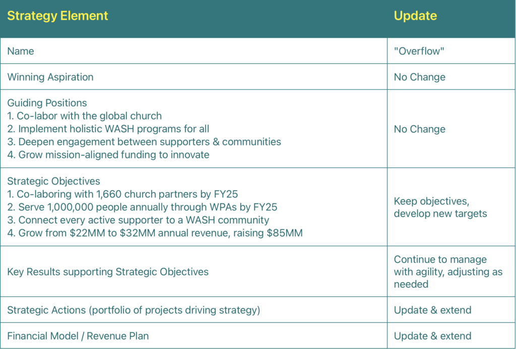 Normally we would spend a year and create a new strategy. Instead, we will build on the Overflow strategy that is divinely inspired and socially constructed. The board has approved to extend the strategy with some minor adjustments: