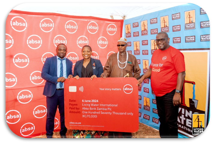 Living Water Zambia’s Country Director, the Honorable Minister of Justice, His Royal Highness Chief Chitanda, and the ABSA Director of Business Banking.