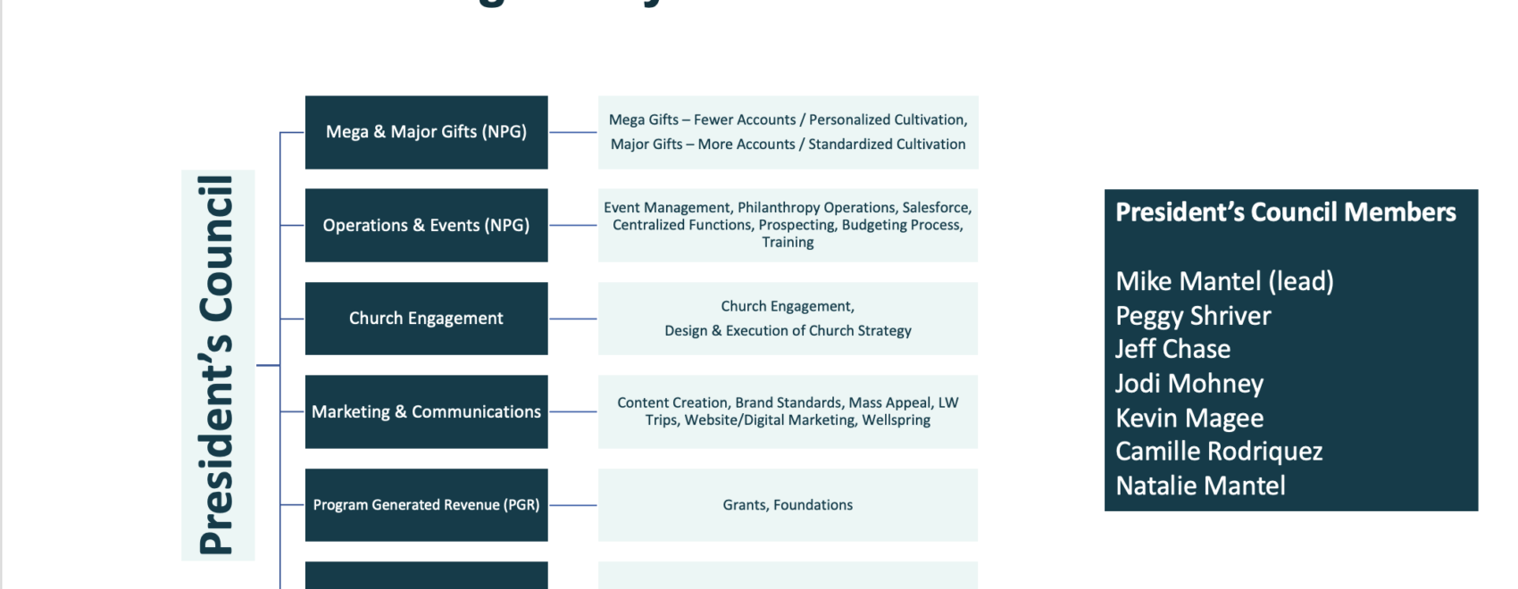 Peggy will continue to serve the organization and has requested to focus her energy on philanthropy operations and events (foundational “block & tackle”, systems, training, events, prospecting, etc.). Considering the upcoming Watershed Weekend event next May, this will create a focused cross-team effort to support this all-important major donor acquisition activity. In place of the CDO position we are creating a President’s Council to represent and coordinate the entire funding ecosystem of NPG, Operations, M&C and Trips, US Church Engagement, and PGR (dotted line).