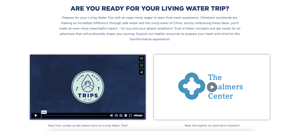 Pre- and post- trip communication series: We added in 2 new automatic pre-trip emails, including a “deeper dive” into Living Water, a welcome video from the staff, and a pre-trip reflection. We added 4 post-trip emails, including thank you videos from the field staff and engagement opportunities for participants to stay involved after their trip. These will be sent automatically through Salesforce!