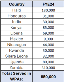 The number of people served in WASH Program Areas is an annual estimation of the number of direct and indirect beneficiaries from within our WPAs. This number does not include projects or activities that were done outside of a WPA and is likely an underestimation of the work across our whole organization.
